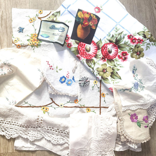 Start your craft adventure here. As well as workshops, we offer great craft kits to get you creating at home. If there is something in particular you'd like but can't see, email and we can put a special pack together for you. There is a LOT of vintage linen here!