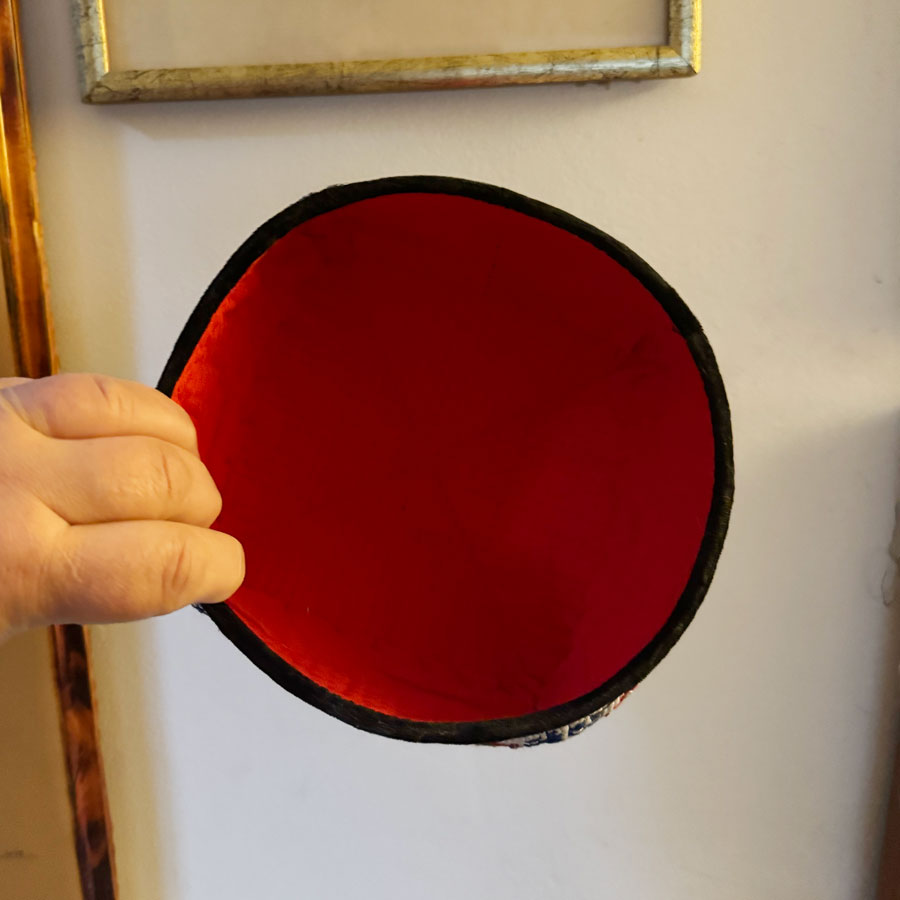 This is a beautiful decorative hand stitched skull cap or doppa. It has a woven floral deisgn with little red beads all over. Interior is lined in red cotton. Black velvet trim.