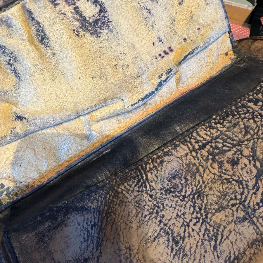 I can't find out much about it. It's very cool, aged looking, interior and inside pocket has black marks so it makes me think its the style rather than wear.