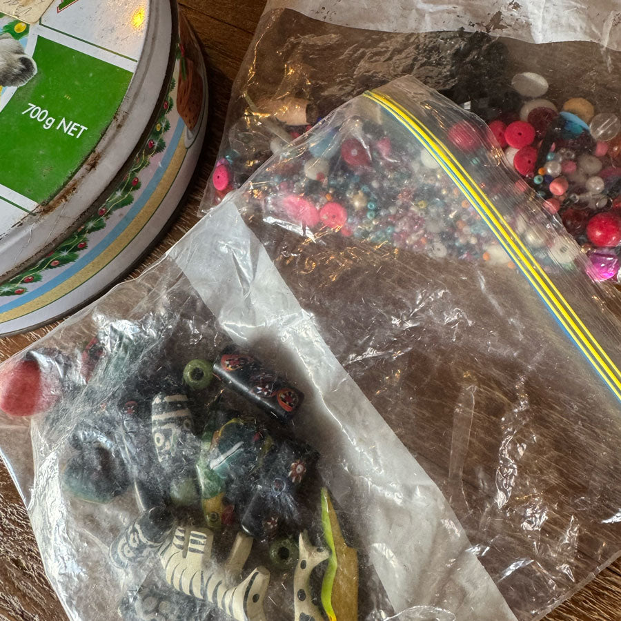 Vintage tin with handwritten note for 'vegetable rissoles' stuck on the front. Two bags of beads inside - one with wooden animals.