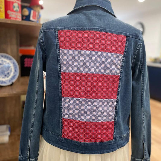 Incredible upcycled denim jackets. These are hand made in the Blue Mountains using recycled goodies including trims, sequins, jewellery, doilies and Mount Vic and Me fabrics. Contact us if you'd like your own jacket designed. Please note: these beautiful jackets are not often included in our generic sale retro gear.