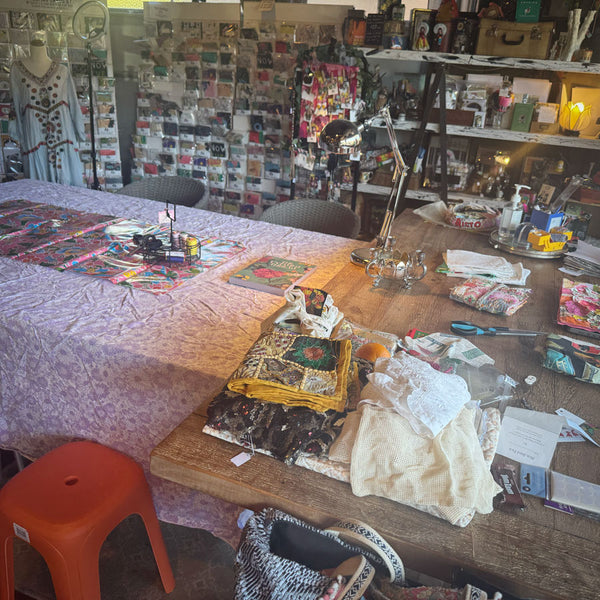 We push back our clothing racks to make a huge space in the shop when workshops are on.