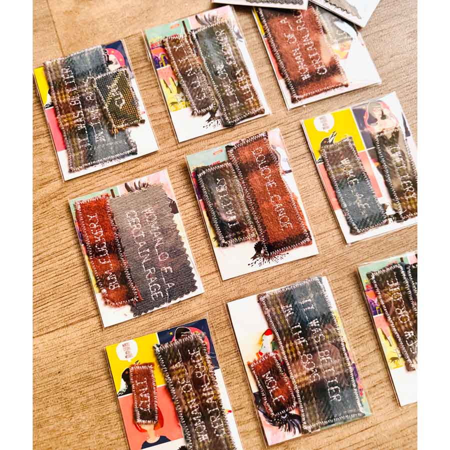 Made from vintage woollen blanket remnants with stitched lettering. I've run a zig zag stitch in white thread (everyone has white thread) so you can sew them to your favourite jacket.