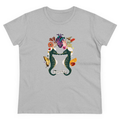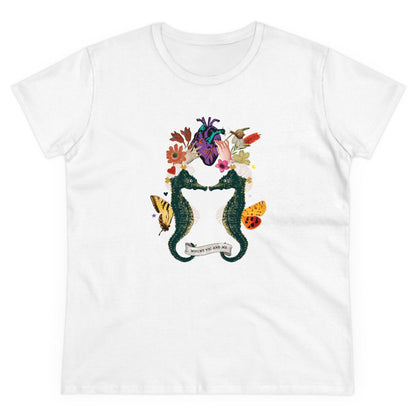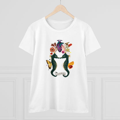 Sea horses are beautiful sea creatures. The male seahorse gives birth. I have two hands at the top holding a hand-drawn heart. Flowers and insects surround them. I thought this t shirt design was a lovely way to celebrate!