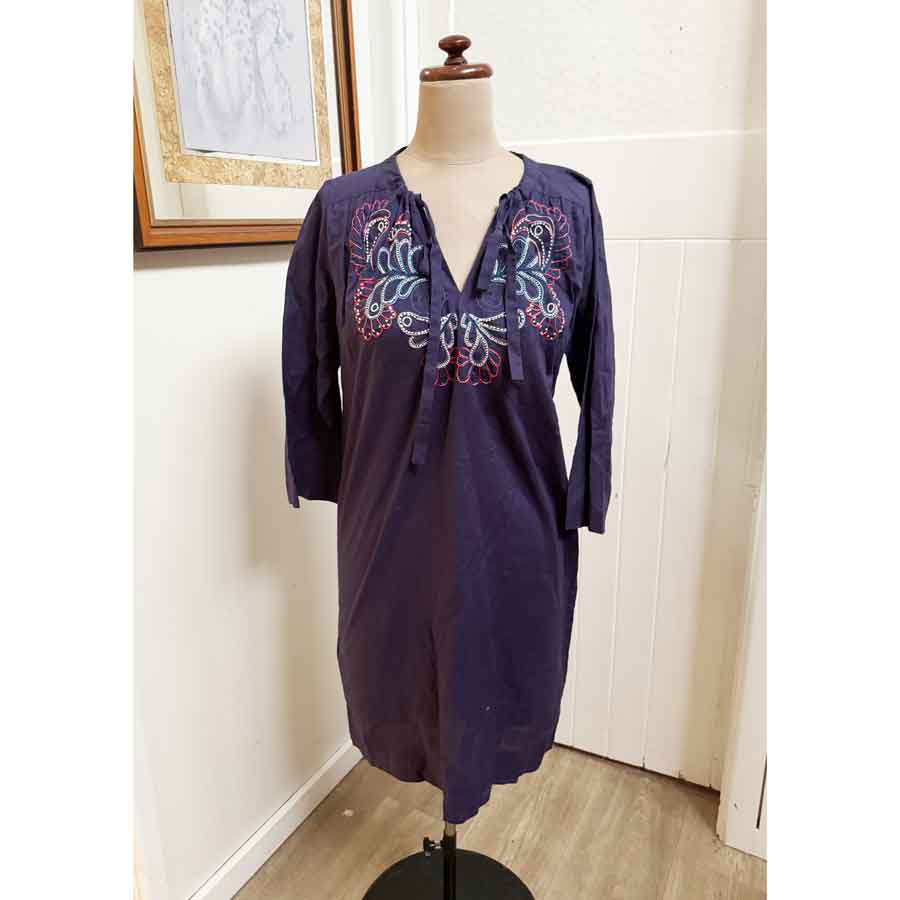 This is a lovely navy cotton shift dress. The collar is designed you can ruche it up or wear the tabs long. Embroidered front. Very pretty!