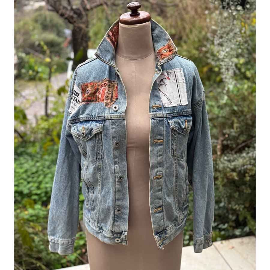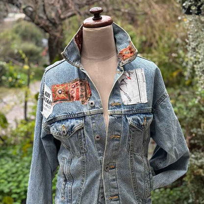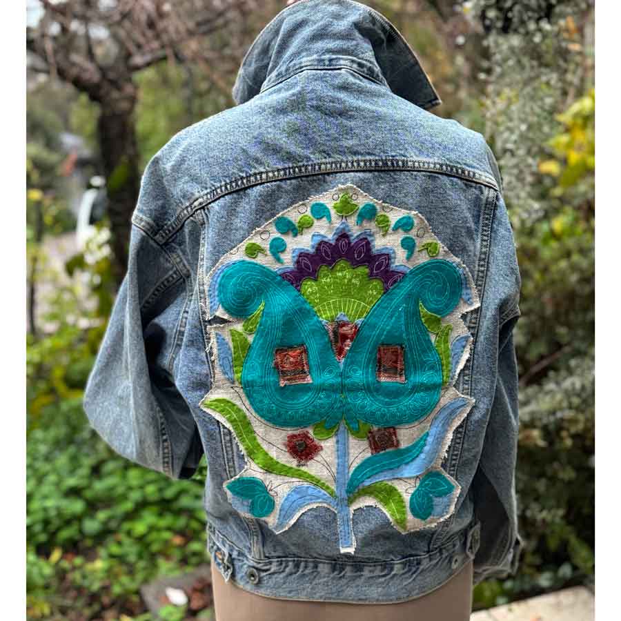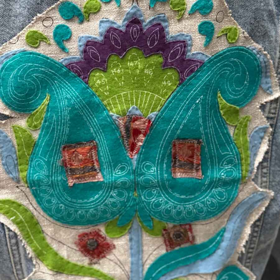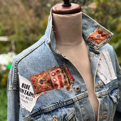 Greaet mid blue denim jacket by Cotton On, nice and chunky. I've added a vintage felt mandala design on the back (someone's unfinished project), some mirrored Indian embroidered fabric and some of my Blue Mountains tea towel remnant fabric. It's so fun!