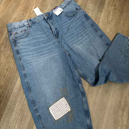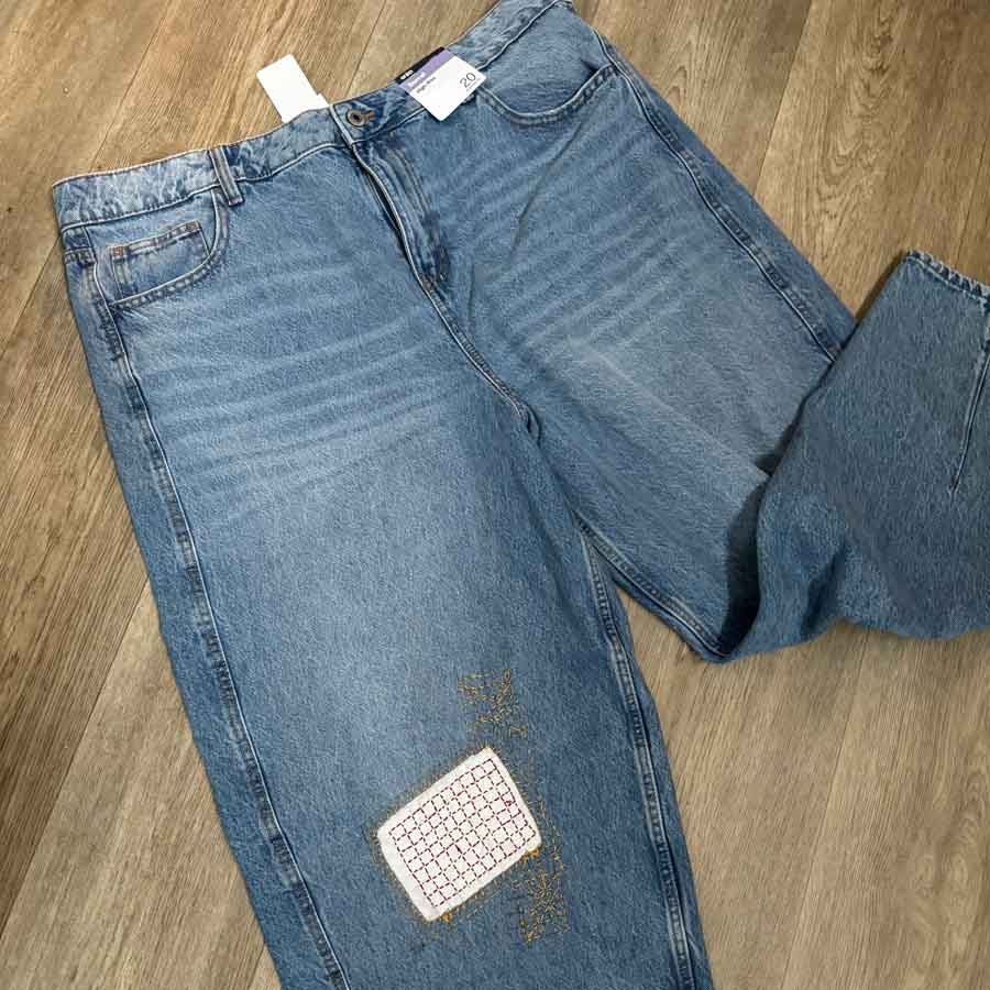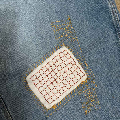 These are amazing jeans. The design is called 'Barrel High Rise' and the have a lovely shape to them through the legs. I have created a patch on the knee area using sashiko japanese style embroidery to add a little something!