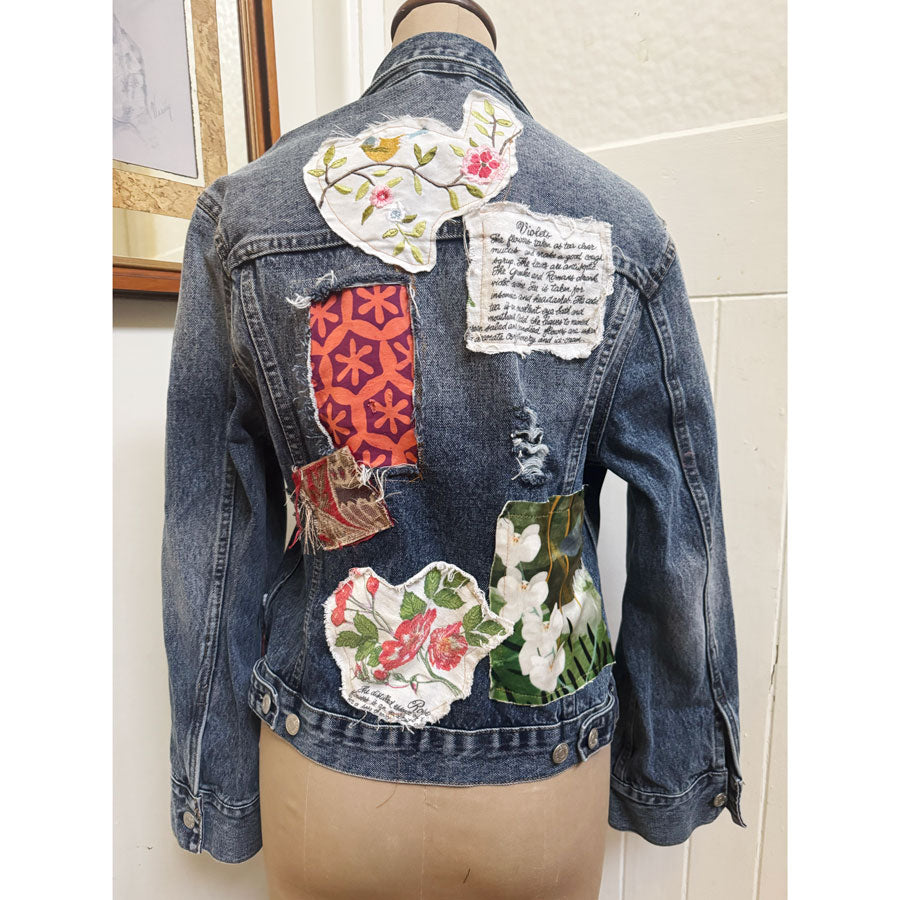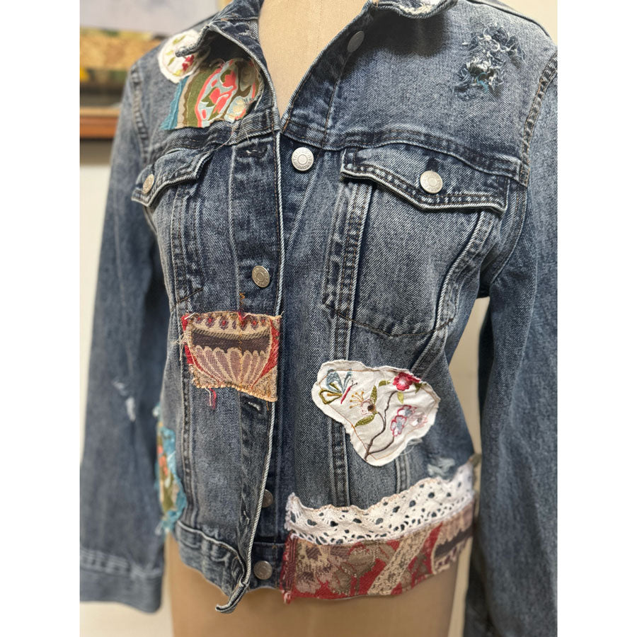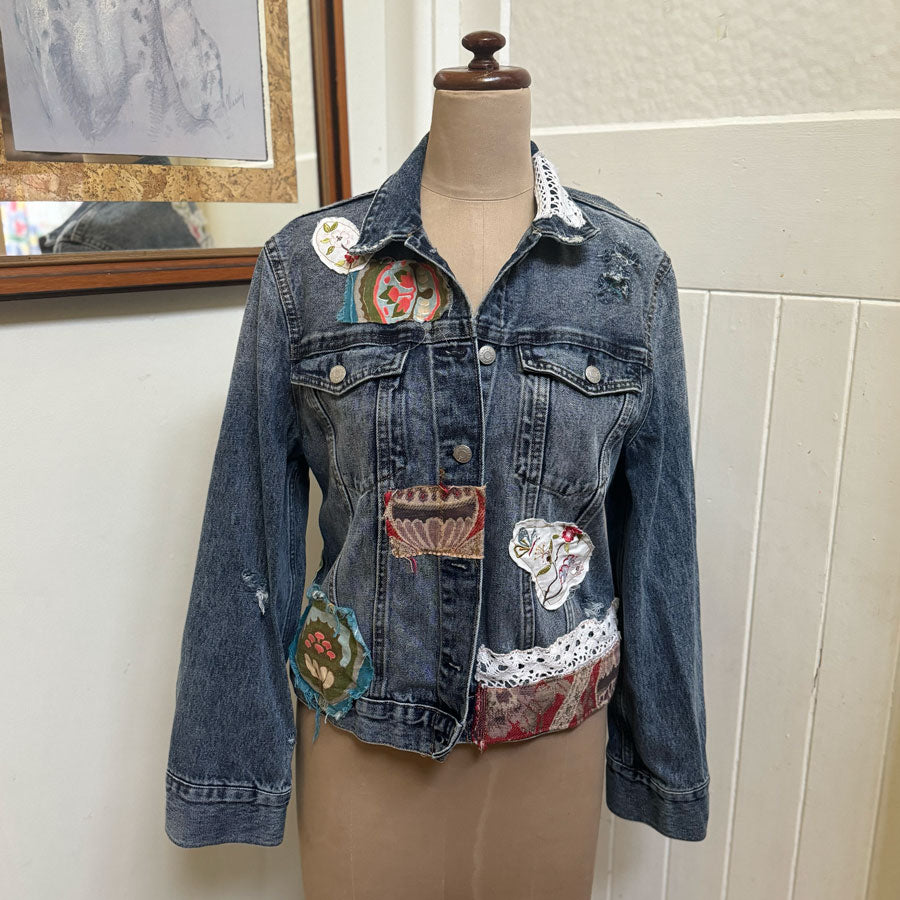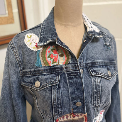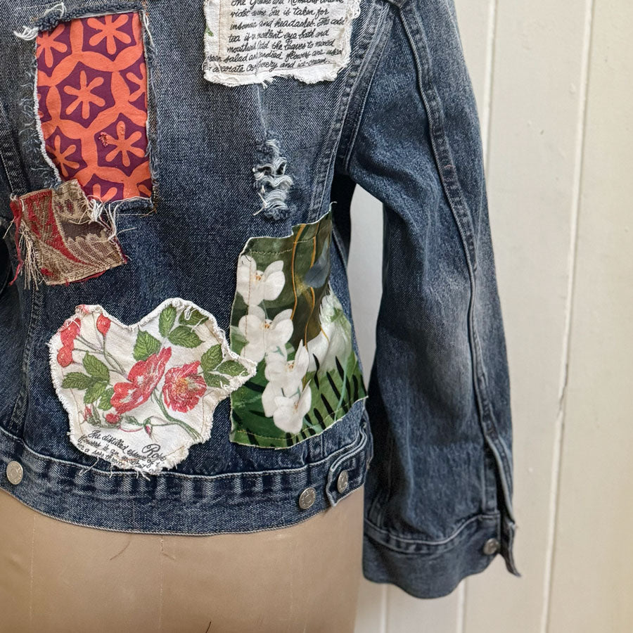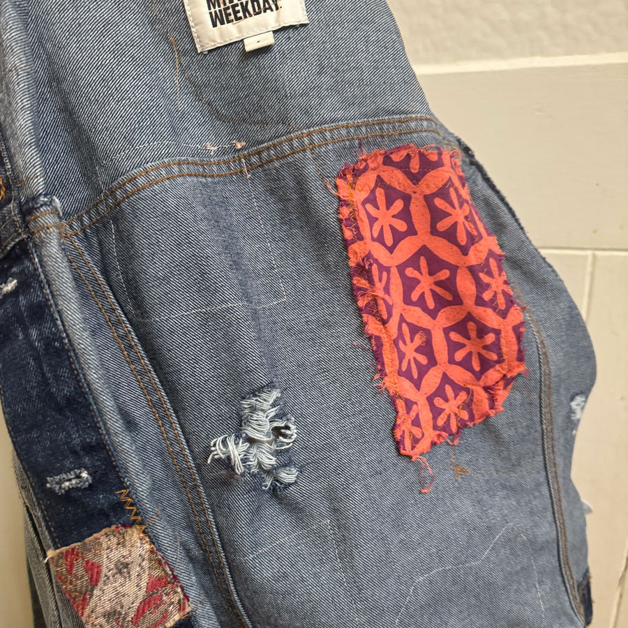 This is a really lovely denim jacket by Weekday. I've upcycled with various vintage fabrics, distressed here and there, washed again to get it frayed and it's beautiful!