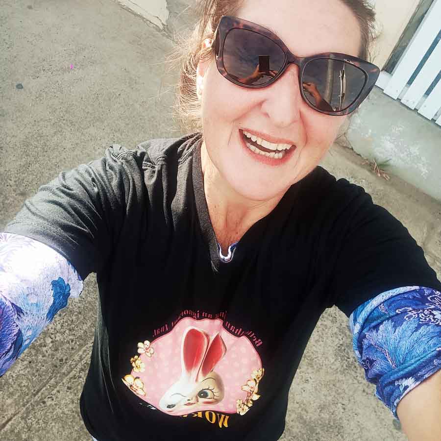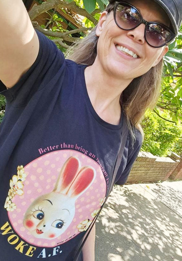 A customer has asked for a WOKE t shirt. Hmmm... I wanted to make it a bit fun and cheeky. I found this 1950's ceramic rabbit, added some vintage ceramic flowers (from an old plate) and some polkadots. I hope you love it!